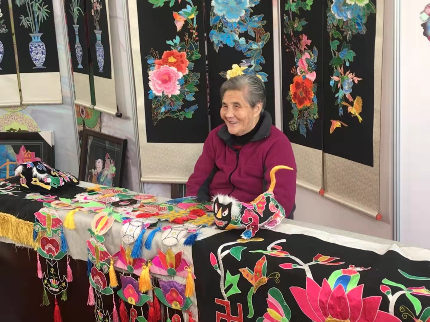 她憑借一雙巧手,自主創(chuàng)作了100余件布貼作品,代表作品《招財(cái)童子》抱被、《哪吒鬧?!辐P尾帽等20余件作品在上海世博會等非遺博覽會展出并大放異彩。