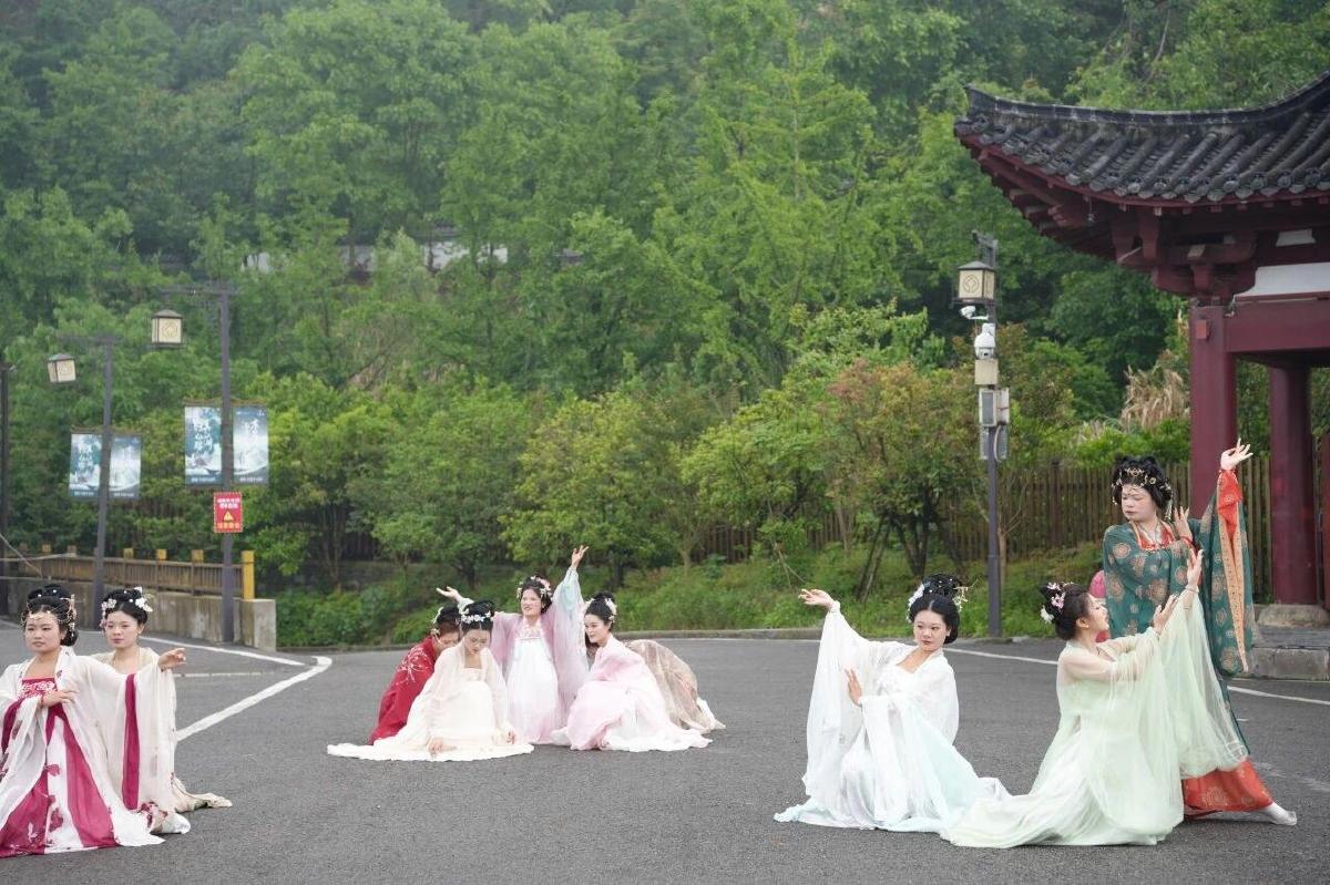 身著漢服的女性游客在東方山景區(qū)內(nèi)游玩