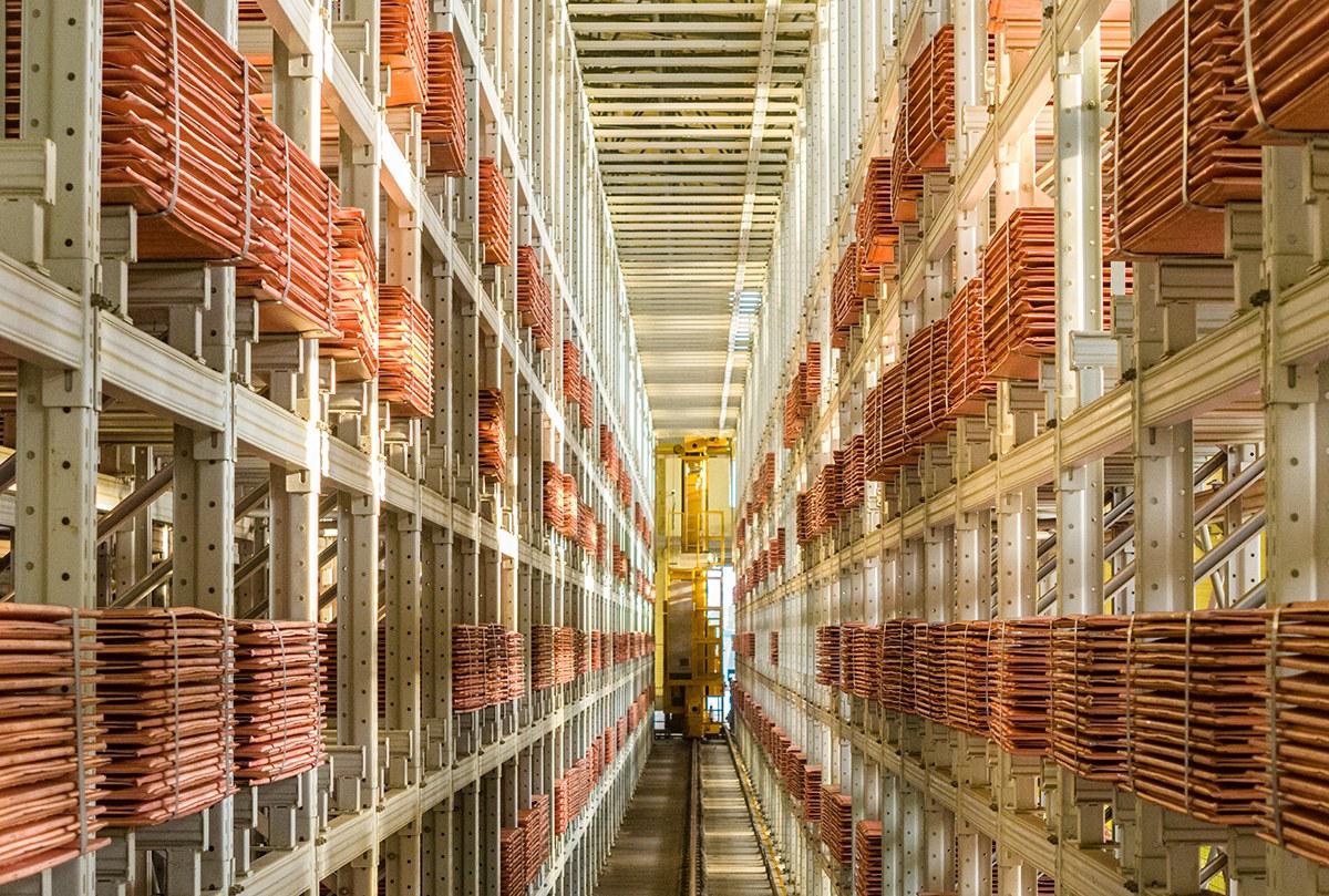 9日,黃石新港園區(qū),中色大冶弘盛銅業(yè)有限公司智能銅庫內(nèi),無人行車正裝載陰極銅有序出庫。
