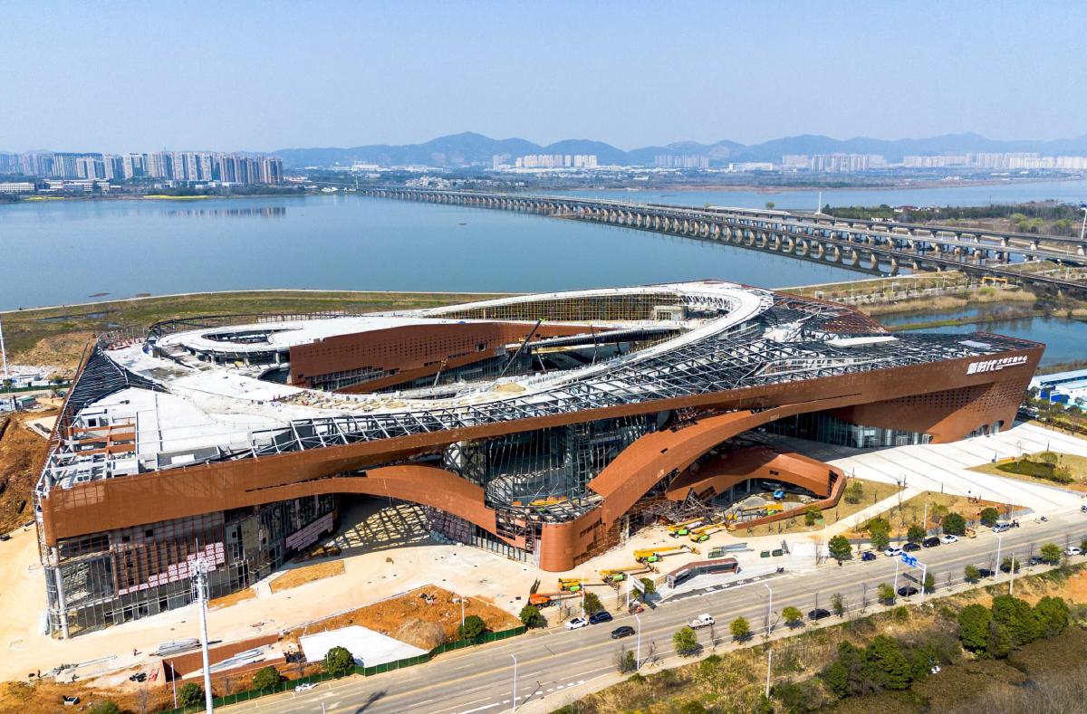 19日,大冶市新時代文明實踐綜合體猶如一座“青銅鼎”屹立于大冶湖畔。
