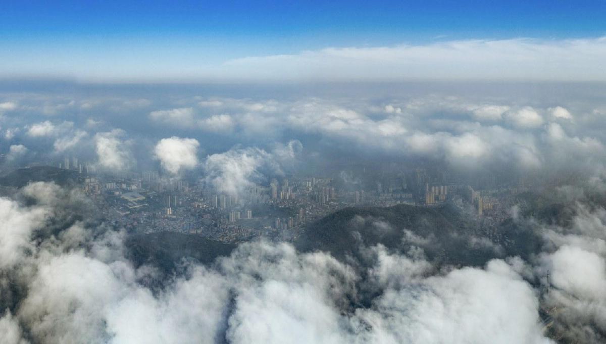 21日,黃石月亮山上云霧翻涌如潮,俯瞰下去,城市在云隙間若隱若現(xiàn),與青山云海相映成趣,宛如一幅流動的水墨畫卷。