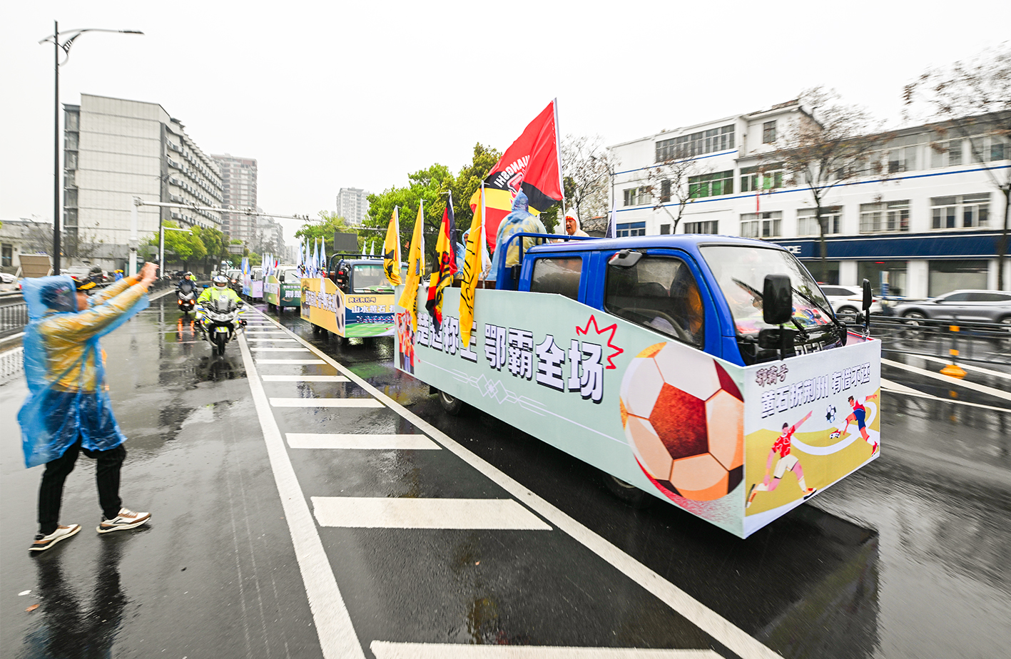 3月31日,黃石市球迷協(xié)會(huì)在城區(qū)啟動(dòng)花車巡游活動(dòng),近百名球迷風(fēng)雨無(wú)阻,用熱情和吶喊為“楚超”開幕吹響沖鋒號(hào)。黃石融媒記者 鄢巍 攝