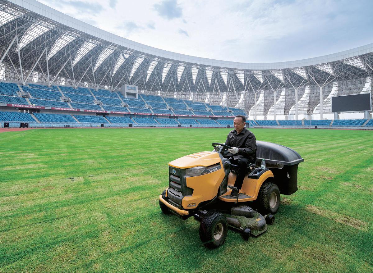 2日,黃石奧體中心體育場內(nèi),工作人員操作專業(yè)設備對修剪后的草坪進行清理養(yǎng)護。場館對賽事天然草坪實施精細化管理,保障草坪長勢良好,以一流場地條件保障賽事舉辦?!↑S石融媒記者 石勇 攝