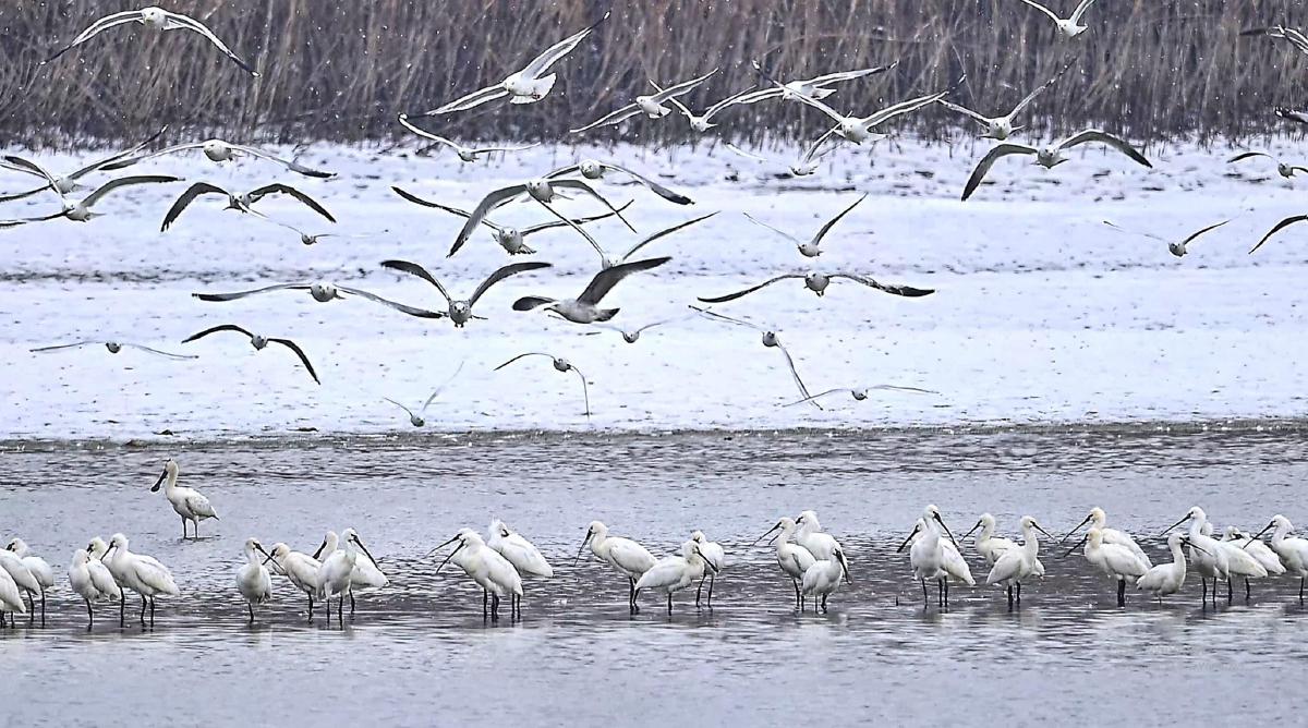 21日,大冶湖畔,成群鷺鳥在積雪未消的淺灘上歡快覓食,呈現(xiàn)一幅冬日美麗生態(tài)畫卷。近年來,大冶湖生態(tài)環(huán)境持續(xù)改善,這里已然成為越冬候鳥的樂園。黃石融媒記者 周巍 通訊員 柯聞峻 攝