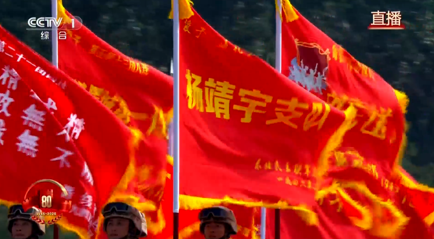 楊靖宇連、劉老莊連、狼牙山五壯士連……上午9點58分,東風(fēng)猛士搭載80面抗戰(zhàn)英模旗幟來到天安門廣場受閱,肩扛著抗戰(zhàn)英烈的精神火炬與民族榮光。戰(zhàn)旗方隊接受檢閱的80面戰(zhàn)旗,從全軍各部隊遴選確定,來自東、南、西、北、中五大戰(zhàn)區(qū),涵蓋陸、海、空軍和武警部隊,由團、營、連三級功勛榮譽單位代表組成。戰(zhàn)旗方隊在2019年慶祝新中國成立70周年閱兵中首次亮相,這是第二次成建制組成戰(zhàn)旗方隊參加閱兵。