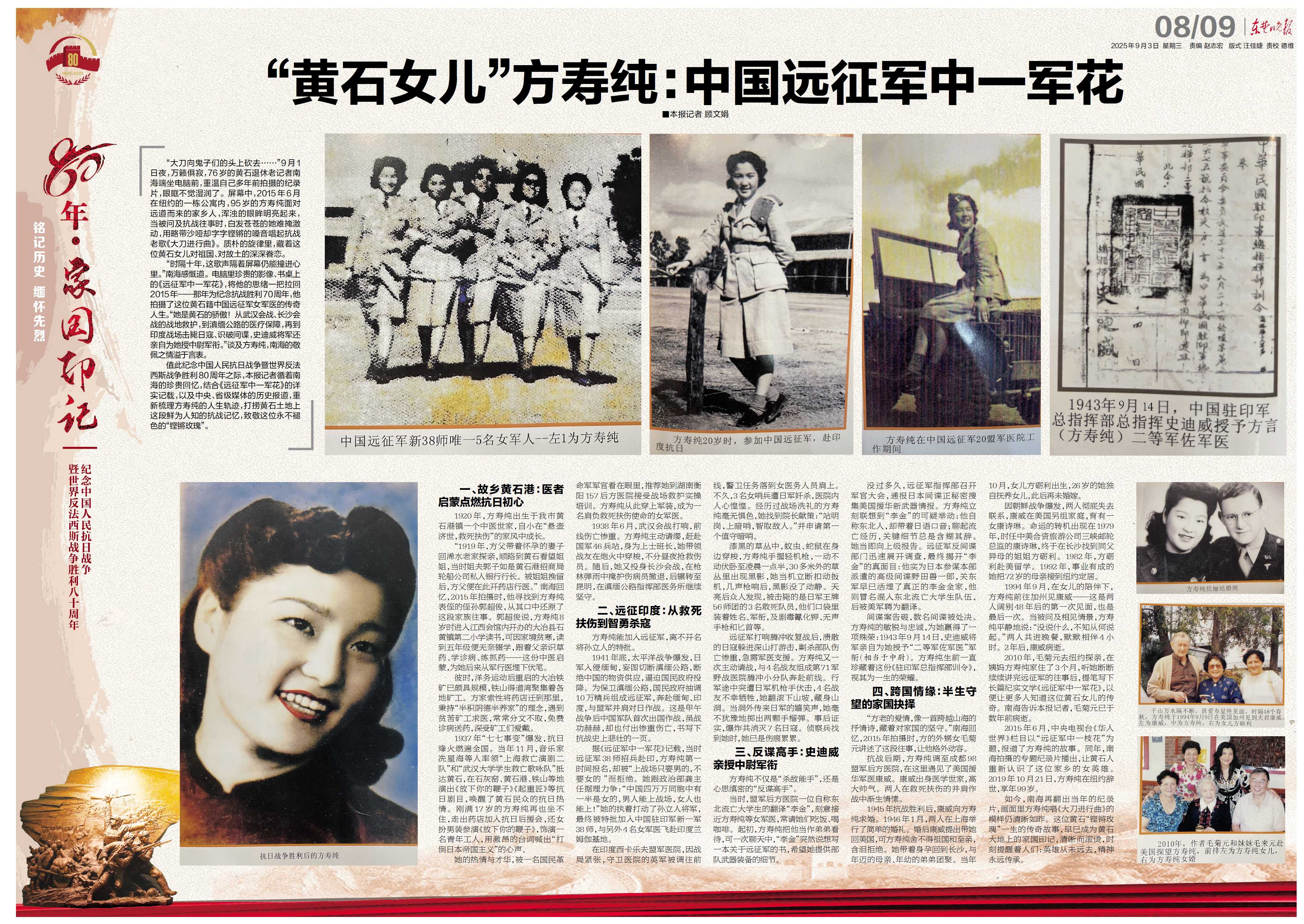 值此紀(jì)念中國(guó)人民抗日戰(zhàn)爭(zhēng)暨世界反法西斯戰(zhàn)爭(zhēng)勝利80周年之際,本報(bào)記者循著南海的珍貴回憶,結(jié)合《遠(yuǎn)征軍中一軍花》的詳實(shí)記載,以及中央、省級(jí)媒體的歷史報(bào)道,重新梳理方壽純的人生軌跡,打撈黃石土地上這段鮮為人知的抗戰(zhàn)記憶,致敬這位永不褪色的“鏗鏘玫瑰”。