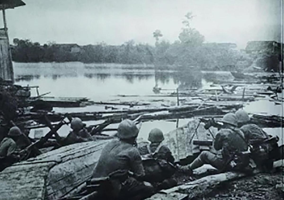 1938年10月2日,富水河岸。侵華日軍藤岡部隊的機槍手正在向中國守軍掃射。
