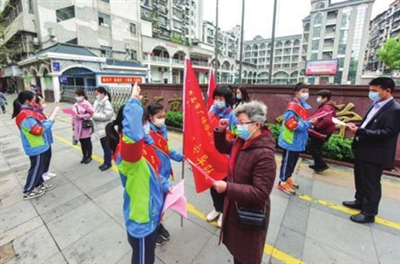 在廣場路小學,每周有52名守規(guī)范、懂禮儀的優(yōu)秀少先隊員上崗,參與學校文明校園的志愿服務行動。課間,“小燕子”們身披綬帶,在校園各樓層樓梯口、走廊等位置進行巡查,對追逐打鬧、亂丟垃圾、沒有佩戴紅領(lǐng)巾等不文明行為進行勸阻。課間操時間,紅領(lǐng)巾志愿服務崗的“小燕子”站在隊伍的最前面,擔任課間操的評委,對各中隊進出場、精神面貌、動作標準等方面進行全面考核。