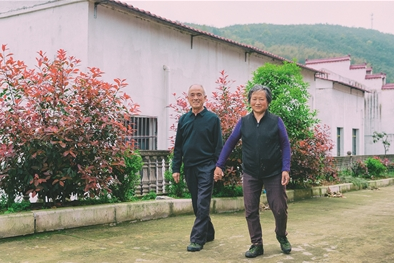 明廷金和老伴柯英在村中散步