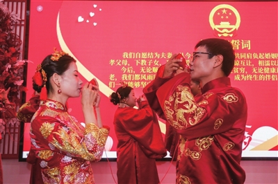活動(dòng)儀式上,8對(duì)新人身著中式禮服在工作人員的組織下行合巹禮,共同許下“相濡以沫?鐘愛一生”的婚姻誓言,認(rèn)真聆聽婚姻咨詢師關(guān)于移風(fēng)易俗的宣講,并集中領(lǐng)取結(jié)婚證。