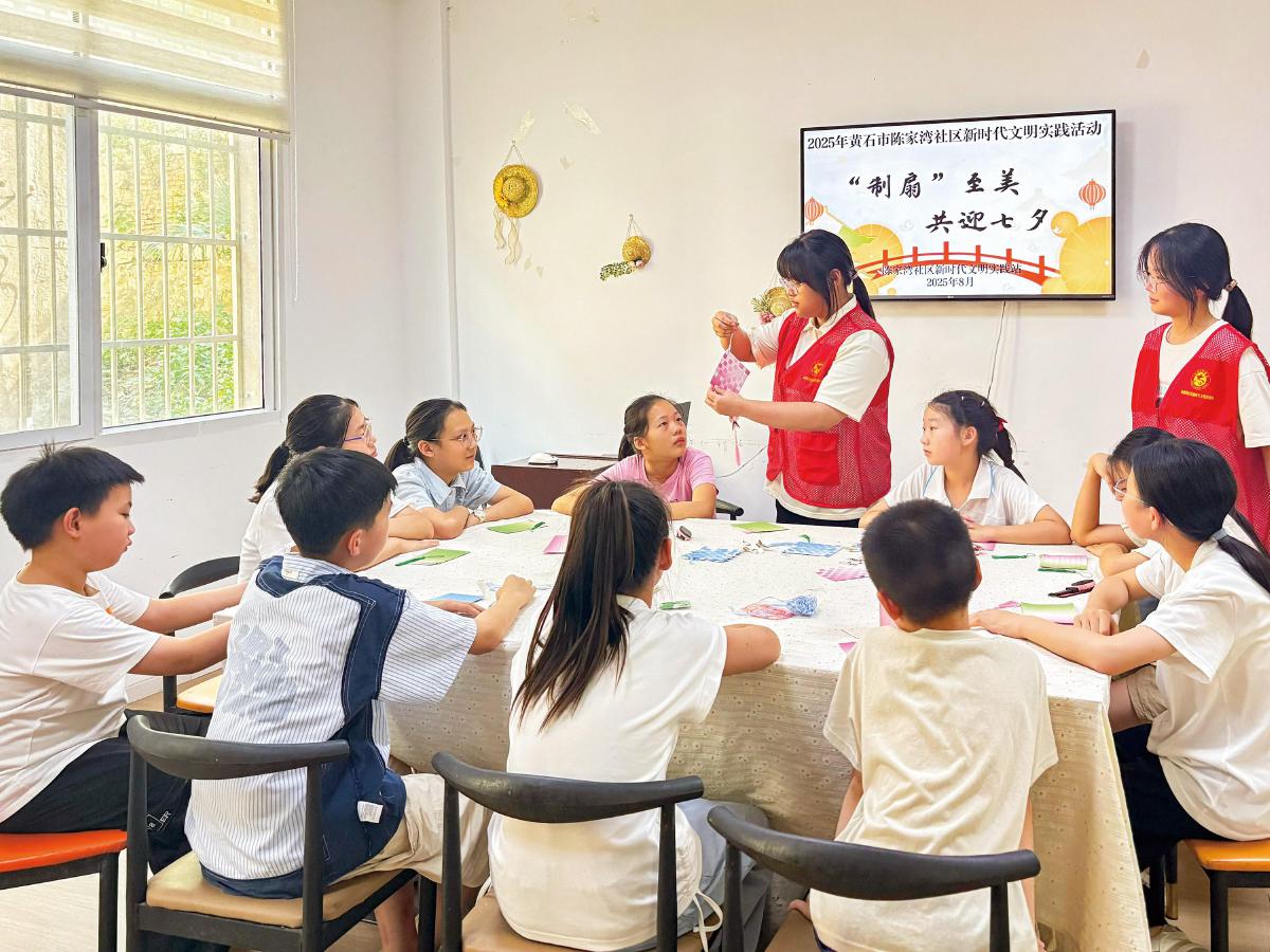 27日,西塞山區(qū)陳家灣社區(qū)新時代文明實踐站組織轄區(qū)青少年開展“‘制扇’至美 共迎七夕”活動。志愿者向青少年示范制作方法,隨后大家充分發(fā)揮想象力,用彩色紙鳶卡搭配流蘇,一件件清新淡雅的紙扇作品在巧手下完成了。(記者 吳山 通訊員 徐雨軒 攝)