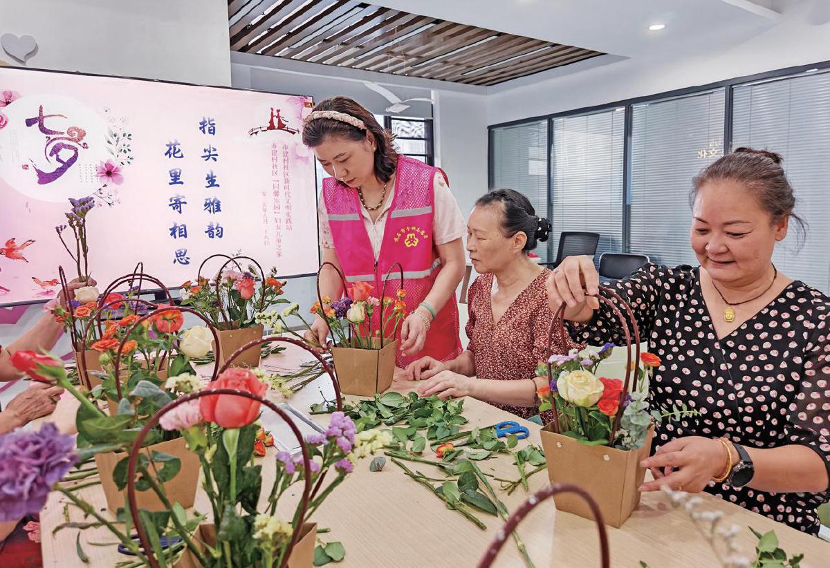 28日,黃石港區(qū)市建村社區(qū)新時(shí)代文明實(shí)踐站聯(lián)合區(qū)婦聯(lián)開展“我在新時(shí)代文明實(shí)踐站過七夕”主題插花活動(dòng)?;顒?dòng)中,居民在花藝?yán)蠋煹闹笇?dǎo)下學(xué)習(xí)插花技巧、交流創(chuàng)作心得。(記者 熊嶠 通訊員 郭靜靜 攝)