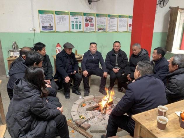 一個火堆、幾排板凳、幾杯清茶,王英鎮(zhèn)黨委書記孔祥鵬、新街村“兩委”干部、灣組組長與鄉(xiāng)賢代表圍坐一堂,氣氛融洽而熱烈。