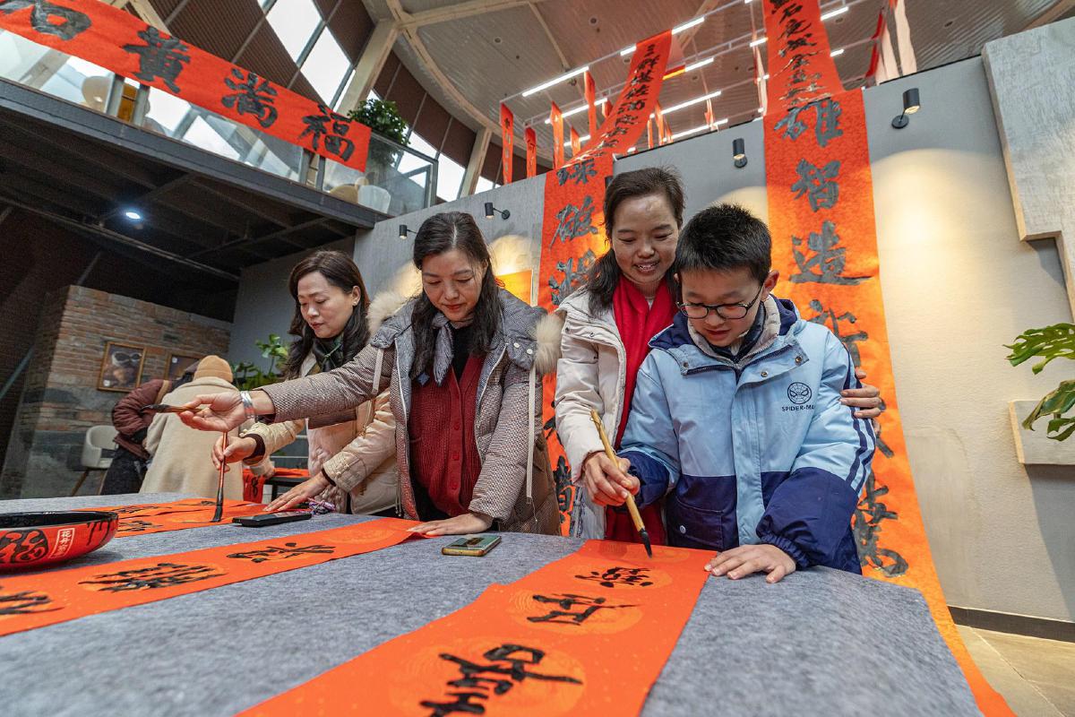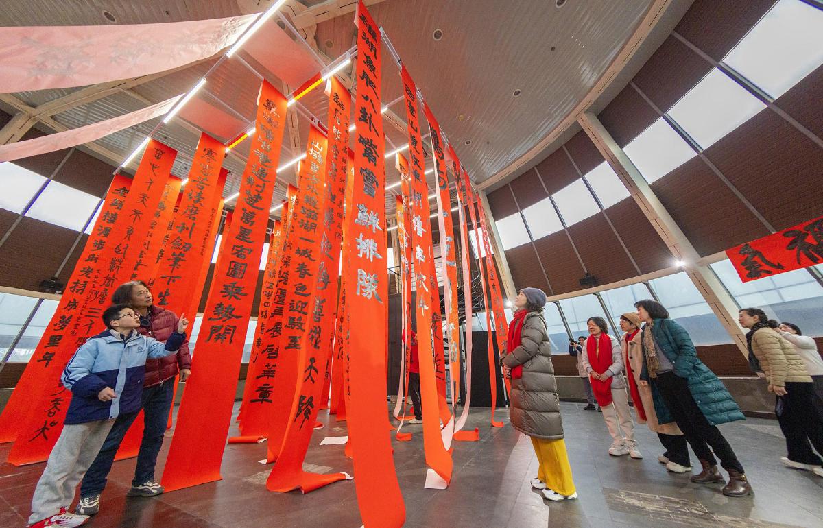 黃石市首屆巨幅春聯(lián)展上,市民在巨幅春聯(lián)前打卡拍照