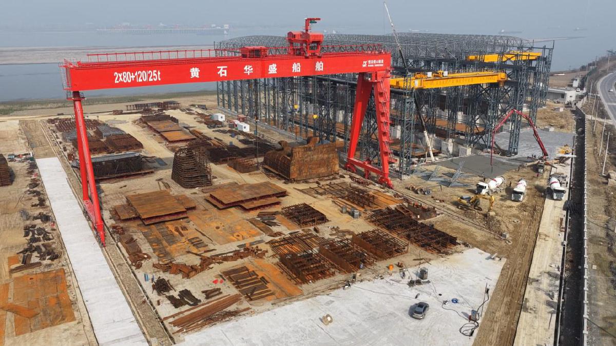 2月11日(農(nóng)歷臘月廿四),南方小年。記者來到位于陽新縣富池鎮(zhèn)的黃石華盛船舶重工有限公司的廠區(qū),原以為臨近春節(jié),船廠會很安靜,但眼前的景象恰恰相反——建廠房和造船同時進行著,龍門吊巍然矗立,鋼鐵手臂此起彼伏,工人們攀在數(shù)艘并排建造的巨輪骨架上,像一群貼著鋼鐵飛翔的燕子。