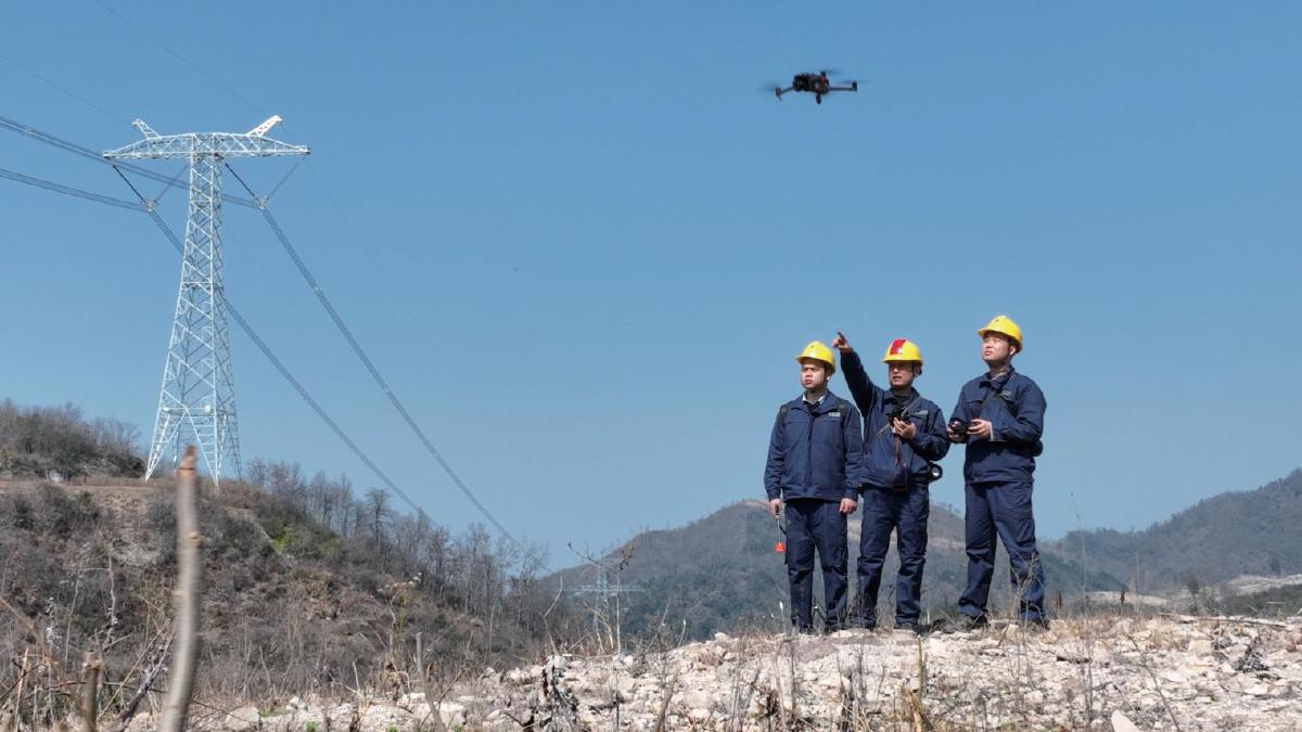 20余分鐘后,三人抵達(dá)一片草地。顧不上休息,他們立即投入工作。陳睿舉起望遠(yuǎn)鏡觀察遠(yuǎn)處鐵塔的同時(shí),叮囑嚴(yán)宇豪用無人機(jī)同步檢查。余朝華則湊到無人機(jī)手柄屏幕前,準(zhǔn)備記錄巡視情況。