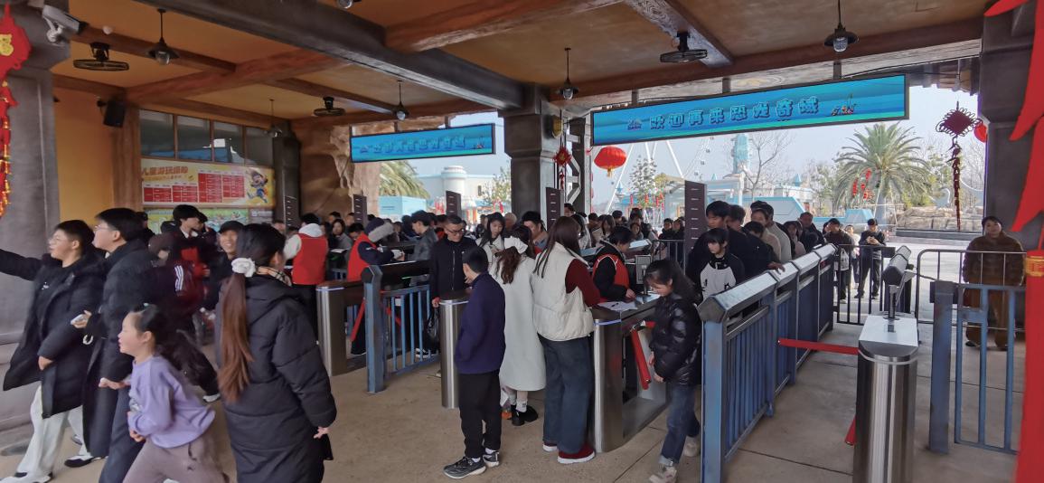 正月初五上午11時(shí)許,園區(qū)入口處已是人頭攢動(dòng)。來自武漢、黃岡、湖南、江蘇等地的游客有序排隊(duì)入園,不少家庭攜老帶幼,手持相機(jī)、牽著孩子,眼中滿是期待,園區(qū)內(nèi)外洋溢著濃濃的新春氣息。